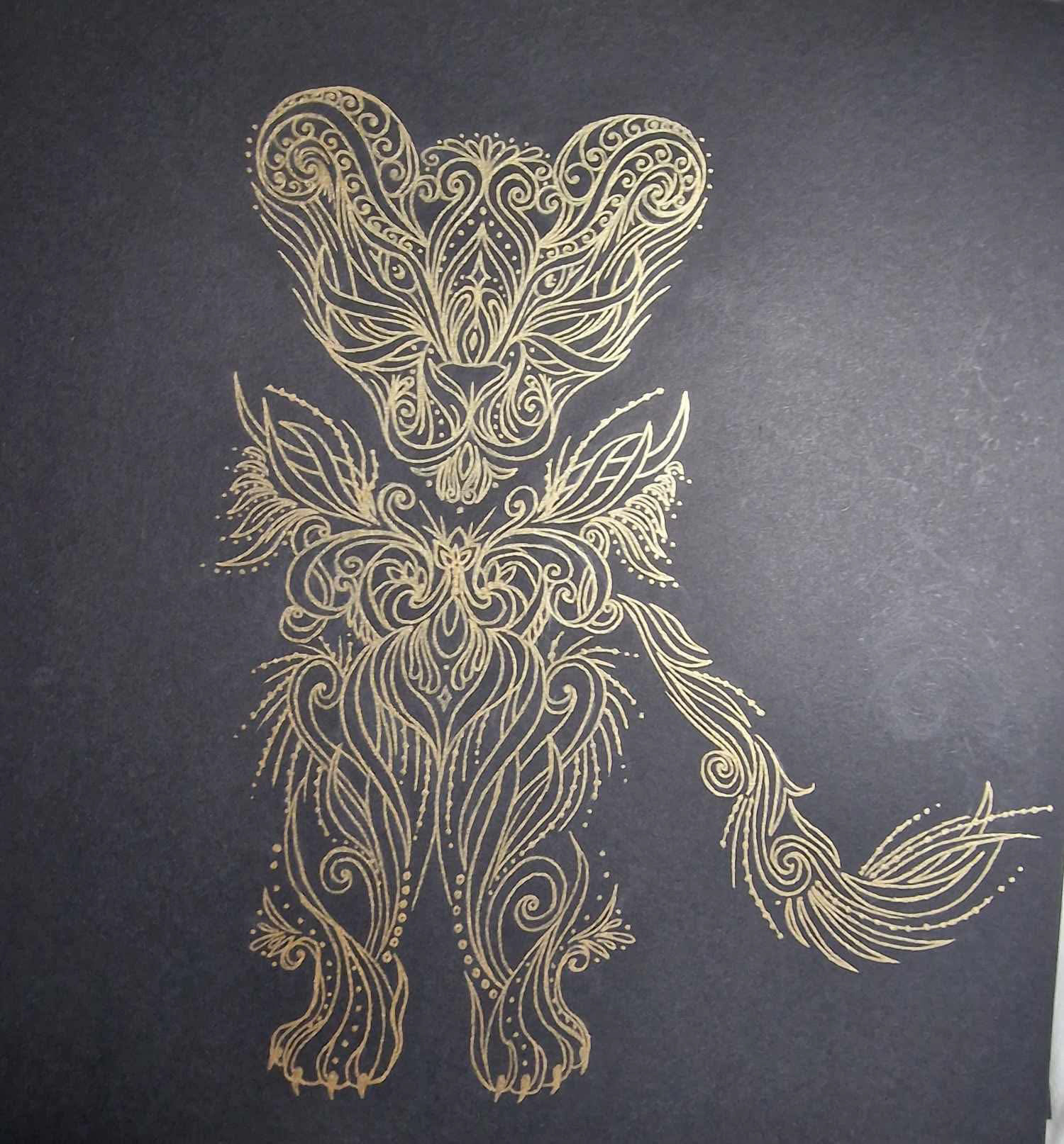 Motivet er skabt med gyldne linjer, der danser i et symmetrisk og detaljeret mønster.