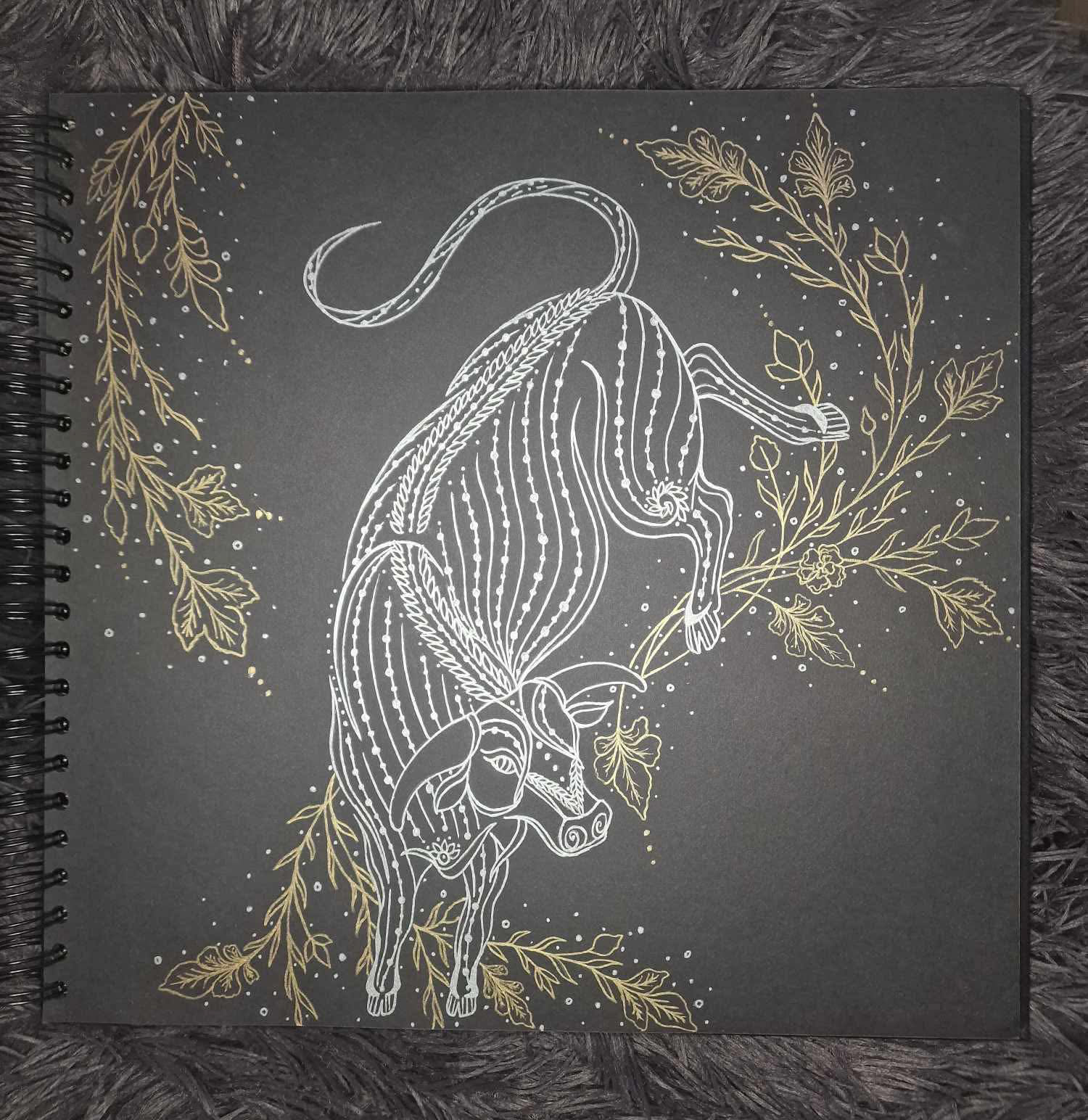 Håndtegnet originalværk på sort lærred i kvadratisk A4-størrelse (ca. 25x25 cm).